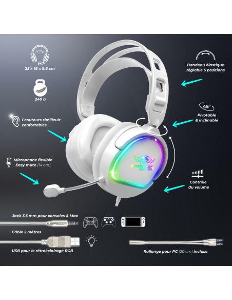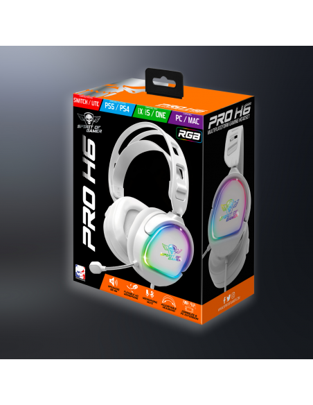 RETRO-ECLAIRAGE Dank seiner USB-Buchse, die dem RGB-System gewidmet ist, wird das PRO H6 beleuchtet und bietet eine ultra-design RGB Rainbow Hintergrundbeleuchtung. Tauchen Sie ein in eine faszinierende visuelle Atmosphäre und lassen Sie Ihre kopfhörer glanz mit eleganz und persönlichkeit während ihres spiels.