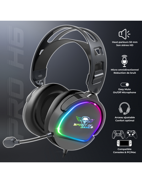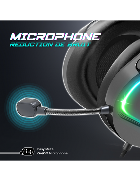 RETRO-ECLAIRAGE Gracias a su toma USB dedicada al sistema RGB, el PRO H6 está iluminado y ofrece una retroiluminación RGB Rainbow ultradiseña. Sumérgete en un ambiente visual cautivador y deja que tu casco brille con elegancia y personalidad durante tus sesiones de juego.