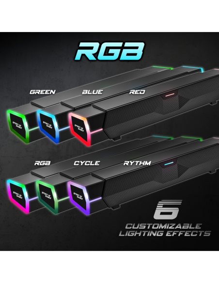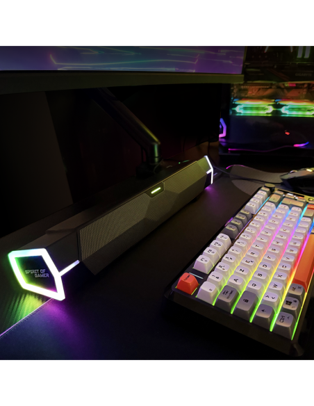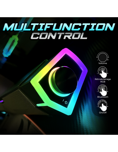 Prenez le pouvoir avec la molette multifonction, votre centre de commande embarqué. Réglez le volume, changez de mode, activez l’éclairage RGB et choisissez parmi 6 effets lumineux pour sublimer votre setup. Affichez vos couleurs et faites vibrer votre espace à chaque partie.