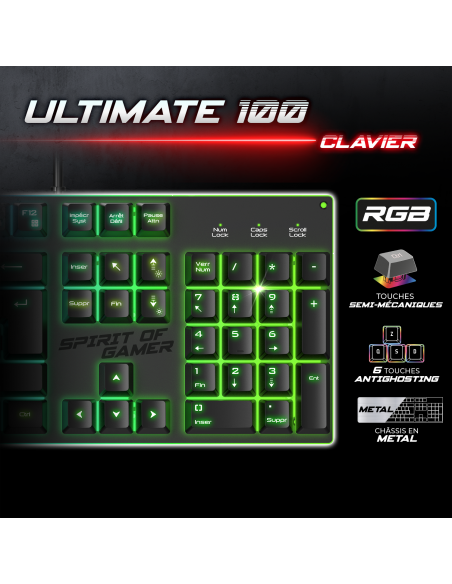 Le clavier Ultimate 100 vous offre un excellent compromis entre confort et réactivité avec ses touches à membrane semi-mécaniques. Son châssis métallique robuste, ses touches rétroéclairées RGB et ses raccourcis multimédia intégrés en font un allié fiable pour le gaming comme pour la bureautique. Jouez, tapez, réagissez toujours avec style.
