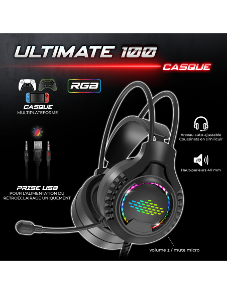Plongez dans l’ambiance avec le casque Ultimate 100 équipé de haut-parleurs de 40 mm pour un son clair et puissant. Son arceau auto-ajustable, ses coussinets en similicuir et sa télécommande intégrée vous garantissent confort et contrôle, tandis que son rétroéclairage RGB Rainbow complète votre setup. Entendez vos ennemis, restez concentré sur la victoire.