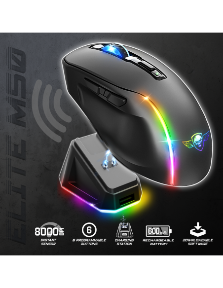 ELITE M50 se distingue par ses 6 boutons programmables, offrant une personnalisation complète grâce à son éditeur de Macro intégré. Son accélération de 10 G, une vitesse de 30 ips et une fréquence de 500 Hz garantissent des performances réactives, tandis que son rétro-éclairage RGB à 16.8 millions de couleurs et ses 7 effets dynamiques ajoutent une touche esthétique unique. Le design ergonomique spécialement conçu pour les droitiers offre un confort optimal, complété par une autonomie impressionnante de 90 heures (sans RGB) et un temps de charge rapide de 3 heures.