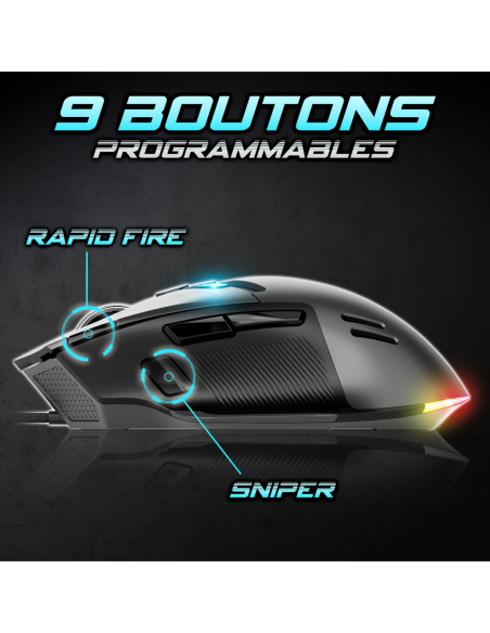 Des boutons pensés pour la victoire : Avec ses 9 boutons entièrement programmables, vous avez toujours une longueur d’avance. Activez le mode RapidFire pour des tirs ultra rapides, ou passez en mode Sniper pour viser avec une précision absolue. Idéal pour les clutchs et les headshots à répétition !