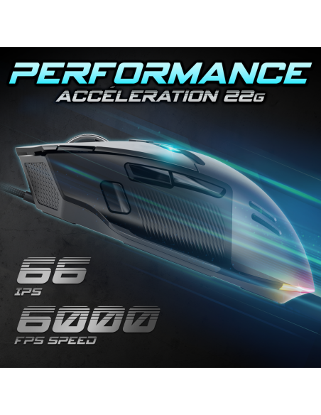 La performance au cœur de l’action : Dotée de switches Huano réactifs, d’une accélération de 22 G et d’un suivi à 66 IPS, ELITE M60 répond à la moindre de vos actions. Un bouton dédié permet d’ajuster le polling rate jusqu’à 1000 Hz. Son câble tressé de 1,75 m vous assure confort et fluidité, même pendant les sessions prolongées.