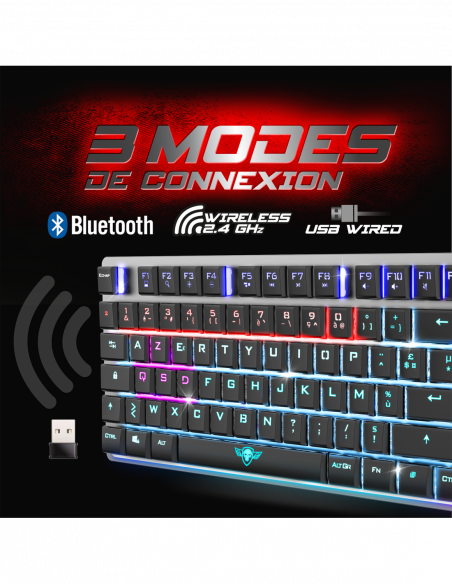 MODOS INALÁMBRICO Y CABLEADO: El teclado ofrece tres modos de conexión. Wireless con las tecnologías RF de 2.4 GHz, Blue tooth y cableado con cable USB desmontable incluido. En el modo Blue Tooth, puedes conectar hasta 3 dispositivos diferentes. Así podrás usarlo en tu teléfono inteligente, portátil y tableta sin tener que volver a conectarlo cada vez.
