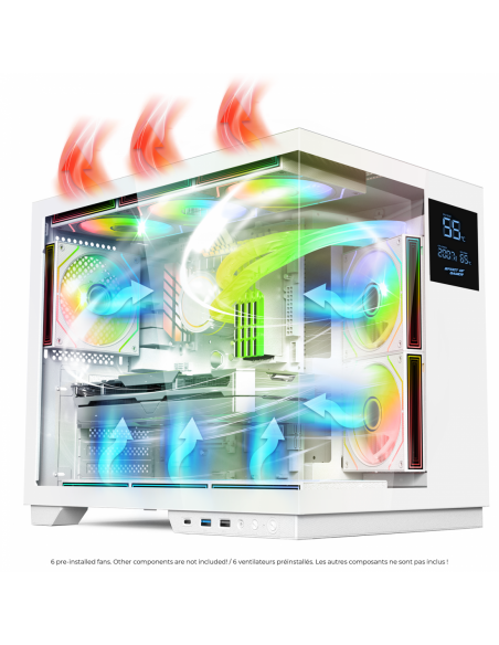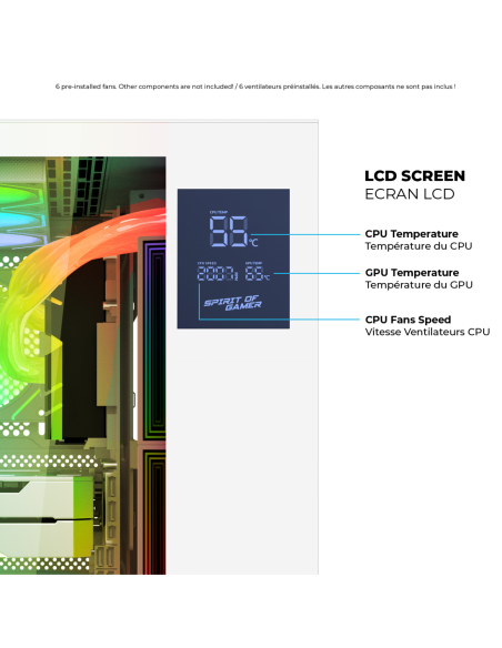 Un suivi en temps réel avec écran LCD intégré : VIPER CRX embarque un écran LCD frontal qui affiche en direct les informations essentielles de votre système. En utilisant l’application Spirit of Gamer, vous pouvez visualiser la température du processeur, la vitesse des ventilateurs et d’autres données clés, pour suivre l’état de votre machine tout en sublimant votre configuration.