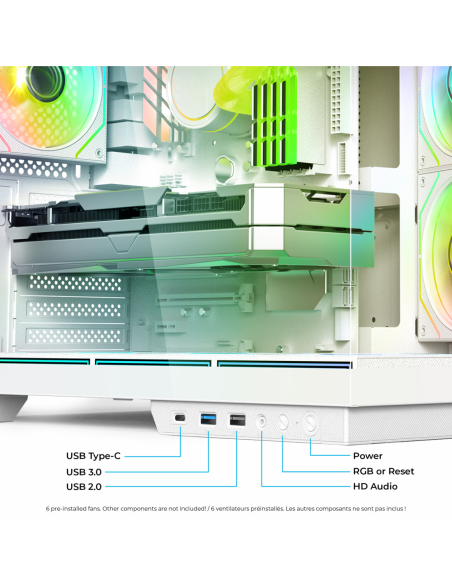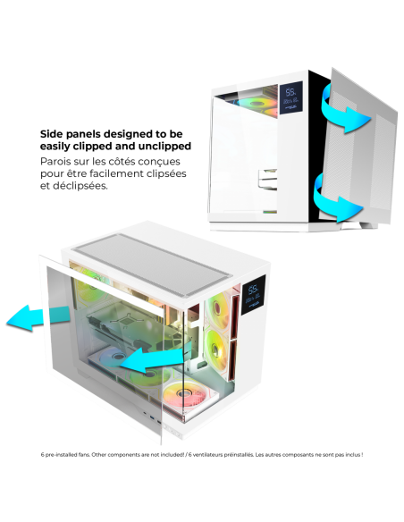 Un châssis haut de gamme pour les configurations extrêmes : VIPER CRX est conçu pour accueillir vos configurations les plus ambitieuses, compatible ATX, mATX et ITX. Avec une capacité graphique jusqu’à 390 mm et un ventirad CPU jusqu’à 165 mm, il offre tout l’espace nécessaire pour des composants puissants et évolutifs. Sa vue à 270°, grâce à sa façade et sa paroi en verre trempé, permet de mettre en valeur votre configuration ARGB et de profiter pleinement de votre setup gaming haut de gamme.