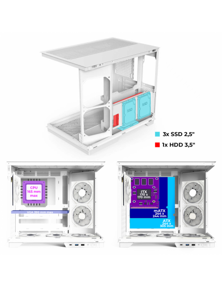 Un espace de stockage et une connectique premium : Profitez d’une connectique moderne avec USB-C, USB 3.0 et HD Audio pour des transferts rapides et un confort d’utilisation maximal. Le VIPER CRX intègre 3 baies SSD 2.5’’ et 1 baie HDD 3.5’’, combinant vitesse et capacité pour tous vos jeux, contenus et projets multimédias.