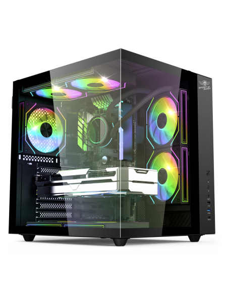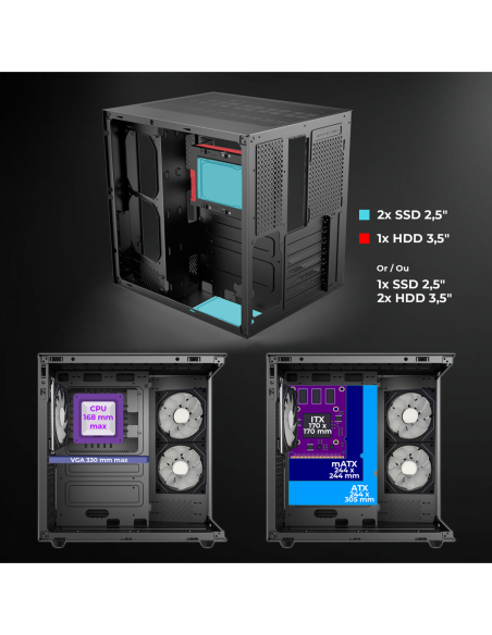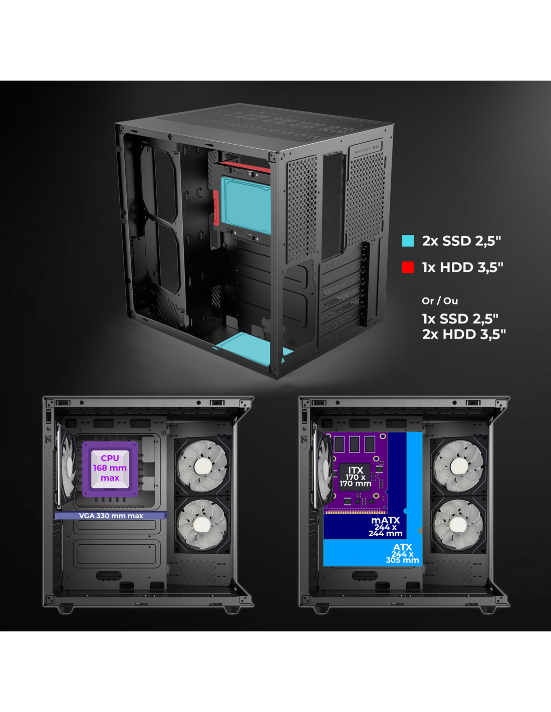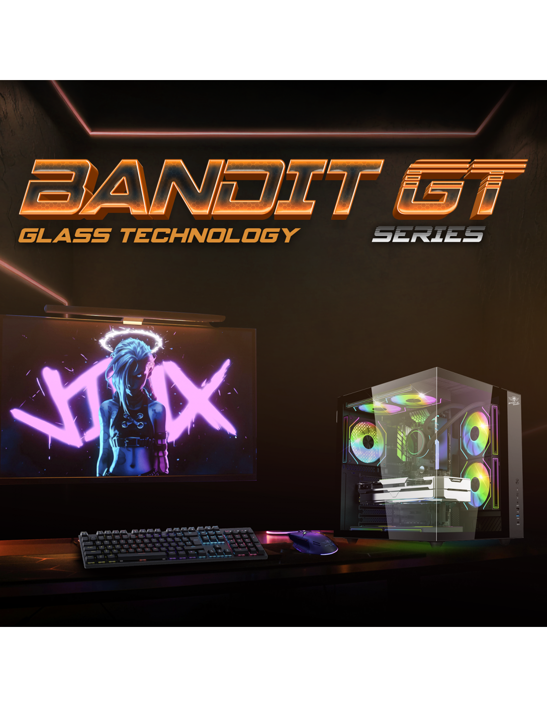 Un châssis compact et performant pour les configurations gaming exigeantes : BANDIT GT a été conçu pour les joueurs qui recherchent un châssis compact, moderne et efficace, sans compromis sur les performances. Compatible avec les cartes mères ATX, mATX et ITX, il accueille des configurations puissantes avec une carte graphique jusqu’à 330 mm et un ventirad CPU jusqu’à 168 mm. Son format optimisé et sa conception soignée offrent l’équilibre parfait entre compacité, ventilation et évolutivité. Il est idéal pour construire un PC gamer performant dans un espace réduit.