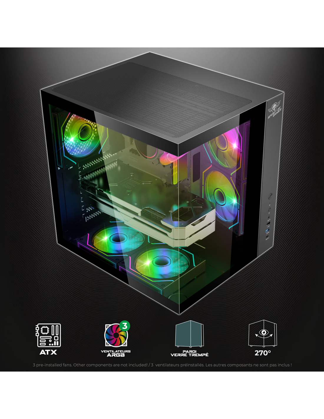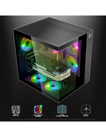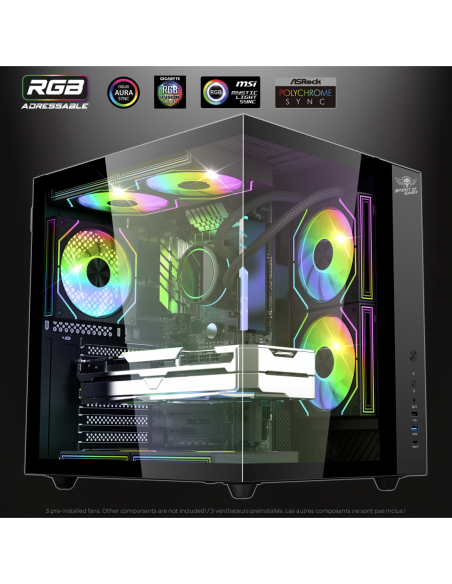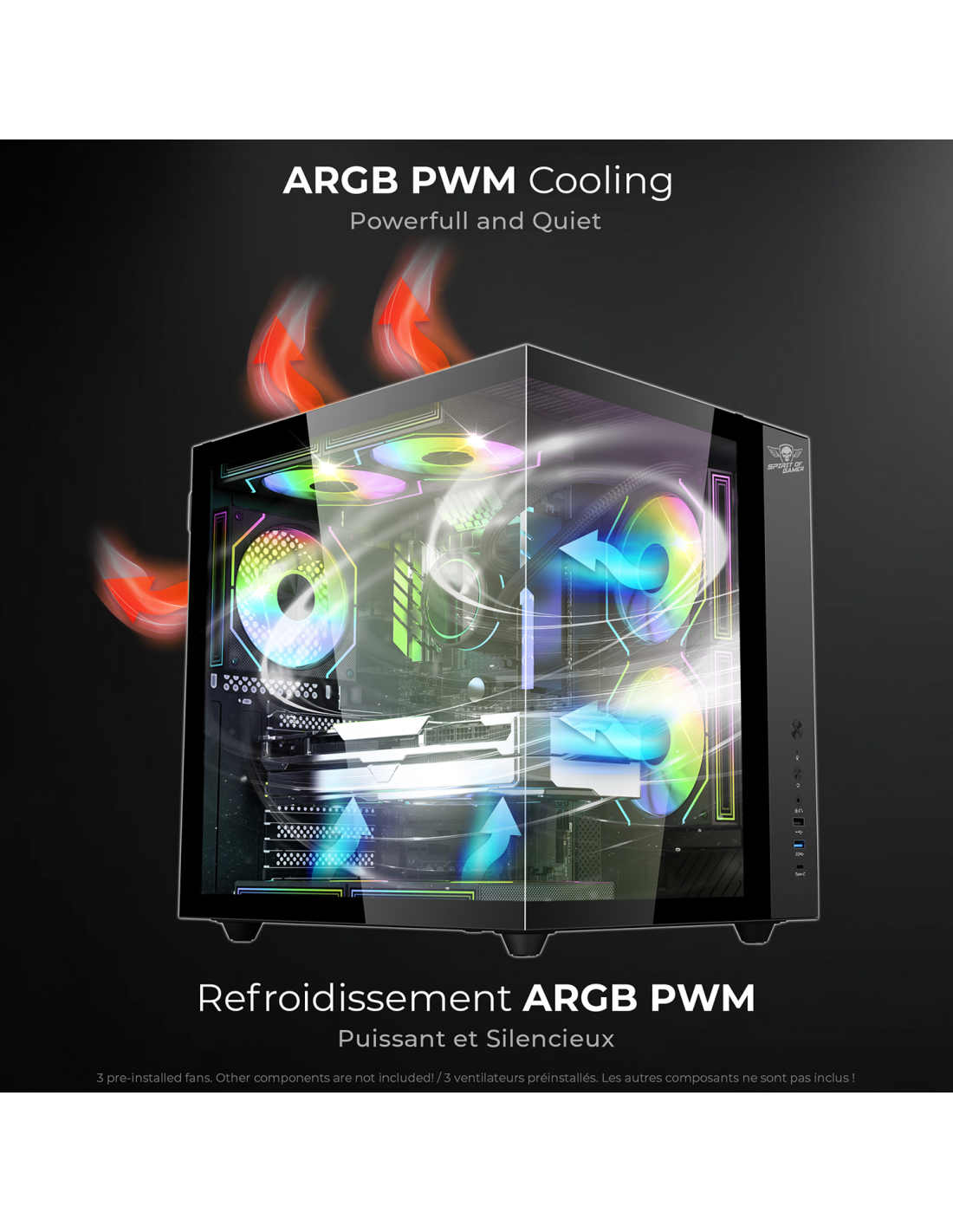 Un refroidissement ARGB performant et évolutif : BANDIT GT embarque trois ventilateurs ARGB préinstallés (2 latéraux et 1 arrière) pour assurer un flux d’air homogène et un refroidissement efficace dès l’installation. Il peut accueillir jusqu’à sept ventilateurs 120 mm et prend en charge un watercooling jusqu’à 240 mm sur la partie supérieure ou latérale. Grâce à ses filtres à poussière amovibles, le système reste propre et performant dans le temps, garantissant une température maîtrisée même lors des sessions de jeu les plus intenses.