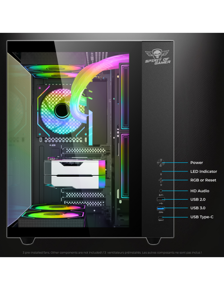 Une connectique complète pour une utilisation moderne : Pensé pour répondre aux besoins actuels, le BANDIT GT dispose d’une connectique frontale complète : 1 port USB-C, 1 port USB 3.0, 1 port USB 2.0, ainsi qu’un connecteur audio HD pour casque et micro. Les boutons Power, Reset/RGB et les indicateurs LED assurent un contrôle rapide de votre configuration et un accès simplifié à vos périphériques, pour une expérience utilisateur fluide et intuitive.