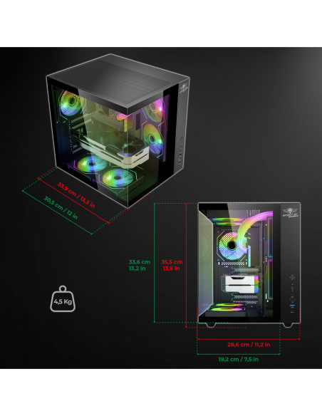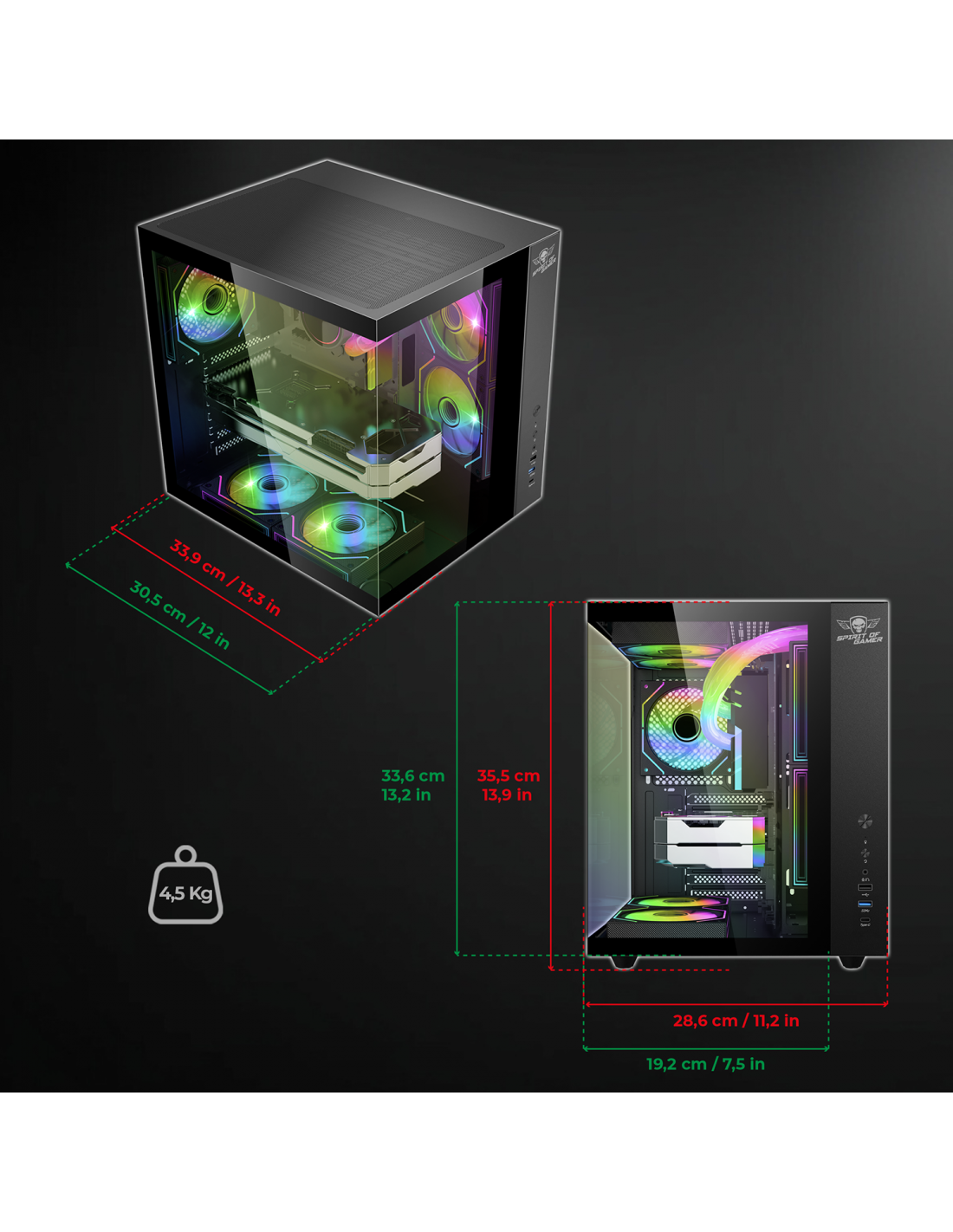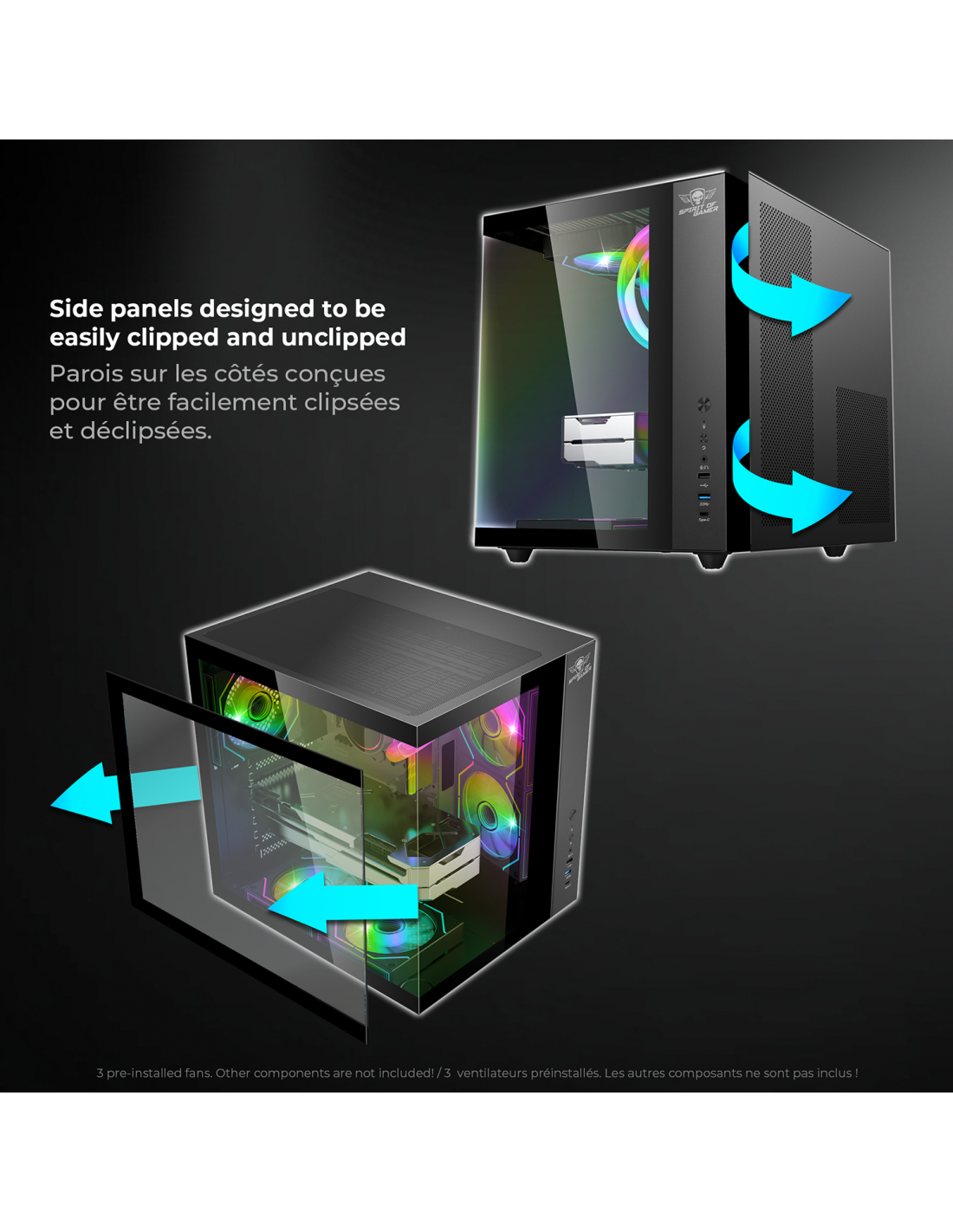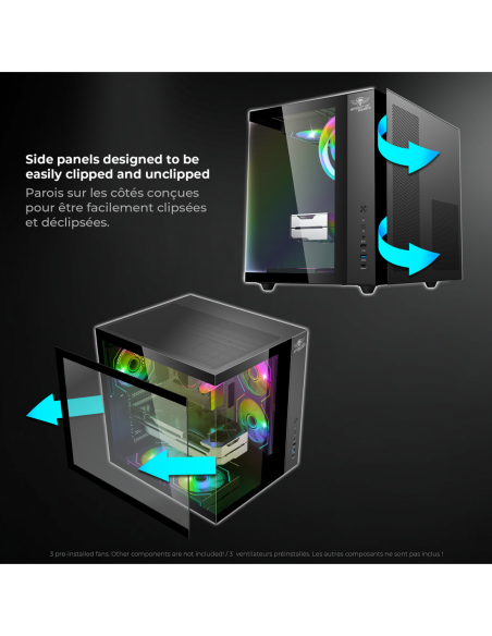 Un design robuste et élégant pensé pour les gamers : Fabriqué à partir d’acier SPCC 0,6 mm, BANDIT GT associe solidité et finition soignée. Sa façade en métal et verre trempé, combinée à une paroi latérale transparente, met en valeur votre configuration ARGB et chaque détail de vos composants. L’ouverture sans outil grâce aux parois clipsables (sauf paroi droite : vis à main) facilite l’entretien et les mises à jour de votre configuration. Compact (33,9 × 28,6 × 35,5 cm) et léger (4,5 kg), BANDIT GT incarne le parfait équilibre entre design, performance et praticité — un châssis prêt à relever tous les défis.
