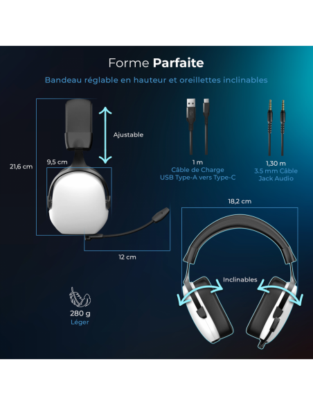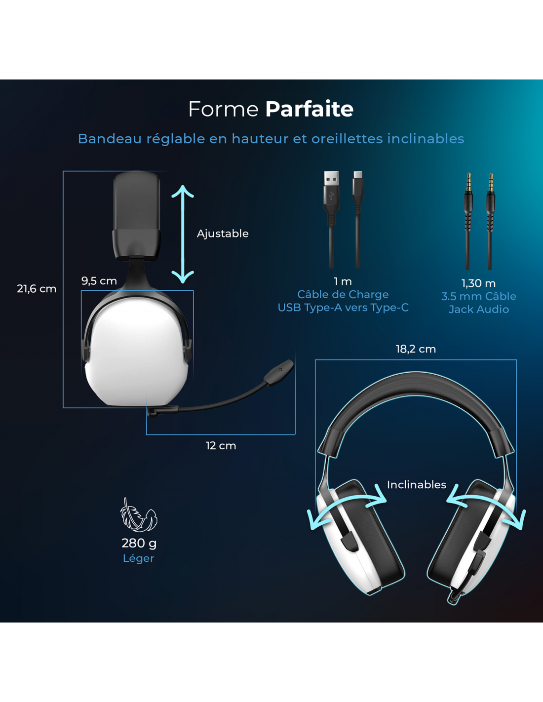 Confort pensé pour vos plus longues sessions : Son arceau ajustable et ses écouteurs inclinables s’adaptent à toutes les morphologies. Les coussinets en tissu respirant réduisent la chaleur et assurent un confort optimal, même après plusieurs heures de jeu. Avec seulement 280 g, XPERT H1400 reste léger et stable, idéal pour enchaîner les marathons gaming.