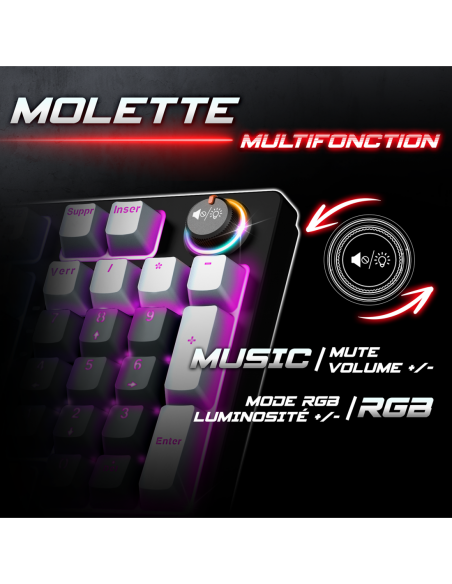 La molette multifonction intégrée vous permet de contrôler à la fois le volume du son et les réglages du RGB. Ajustez facilement le volume, activez la fonction mute, ou changez de mode de rétroéclairage, tout en ayant un accès rapide aux paramètres pour une fluidité optimale durant vos parties.