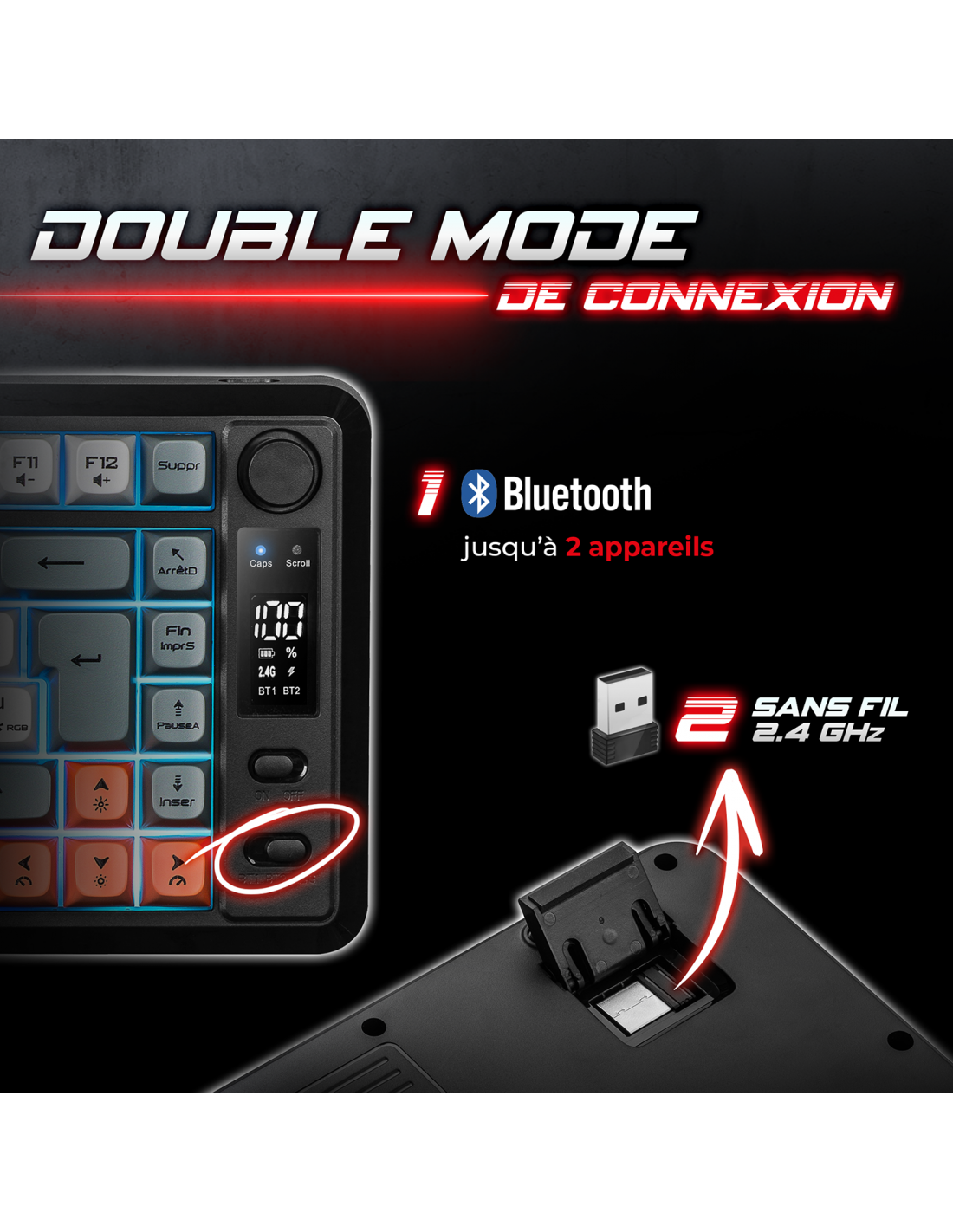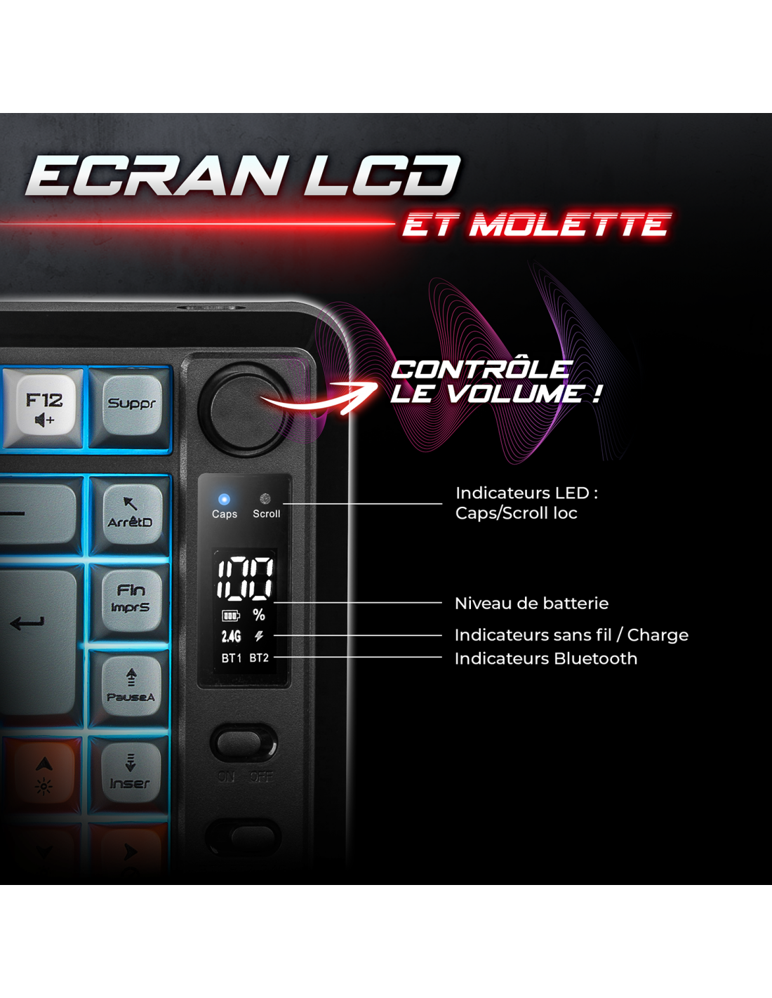 Gardez toujours le contrôle grâce à son écran LCD intégré affichant batterie, mode de connexion et indicateurs LED essentiels. Sa batterie 2000 mAh rechargeable vous offre jusqu’à 190 heures d’autonomie, de quoi enchaîner les marathons gaming.