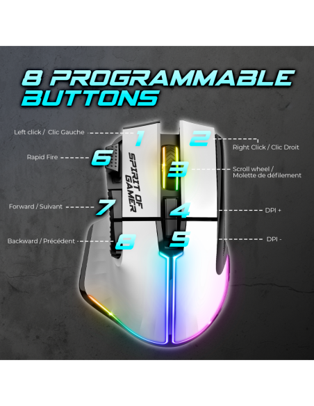 Design ! Pensée pour les droitiers, la PRO M5 offre une forme ergonomique et confortable qui minimise la fatigue lors de longues sessions de jeu. Ses dimensions compactes (12,5 x 8,4 x 4,6 cm) et son poids optimisé de 146 g garantissent une manipulation facile et fluide, offrant ainsi une expérience de jeu agréable et maîtrisée. De plus, les 8 boutons programmables, combinés avec un éditeur de macros complet via le logiciel téléchargeable, permettent une personnalisation totale des commandes pour un avantage stratégique en jeu.