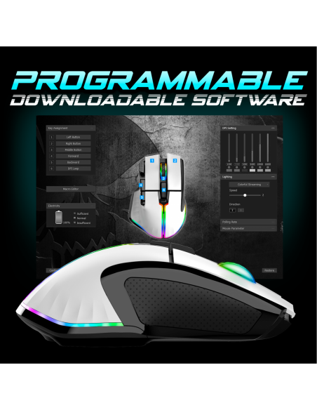 Programmable : le logiciel dédié de la PRO M5, téléchargeable avec seulement 5 Mo d’espace disque requis, offre des options de réglages avancés, y compris la personnalisation des DPI sur 6 plages (800 à 8000 DPI), l'ajustement du polling rate jusqu'à 500 Hz, et la programmation des boutons. Compatible avec les PC équipés d’un port USB et fonctionnant sous Windows®, la PRO M5 est le choix idéal pour les gamers qui recherchent performance, précision et personnalisation sans compromis.