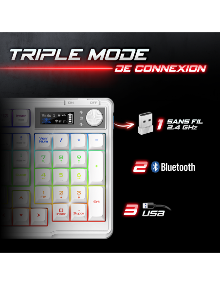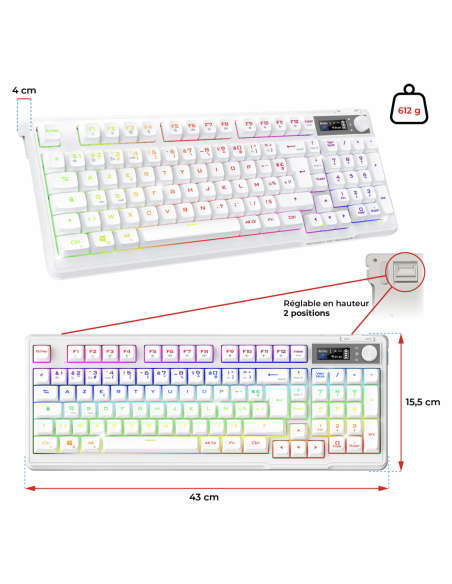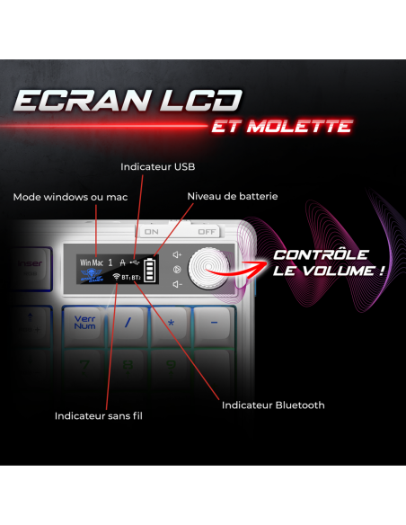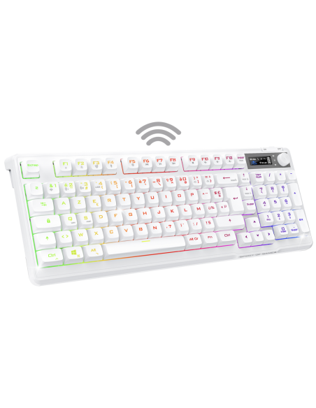 L'écran LCD intégré du ELITE K60 vous informe en temps réel sur l'état de la batterie, le mode de connexion et les indicateurs essentiels comme NumLock, CapsLock, et Winlock. Ne soyez jamais pris au dépourvu grâce à une batterie de 2000 mAh rechargeable offrant une autonomie impressionnante de 360 heures.