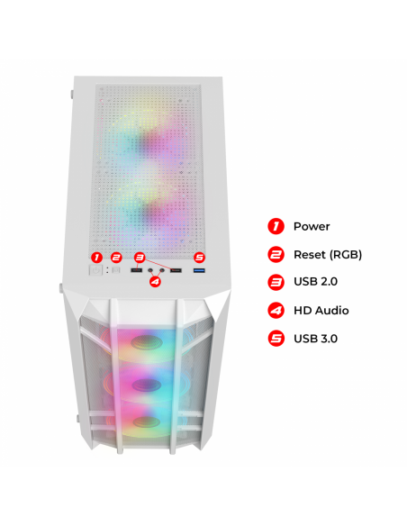 Une connectique complète à portée de main : Le panneau I/O en façade met à disposition 1 USB 3.0, 2 USB 2.0 et une prise audio HD pour casque et micro. Avec ses LED indicatrices, boutons Power et Reset, vous gardez le contrôle de votre setup en toute simplicité, prêt à lancer vos parties à tout moment.