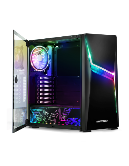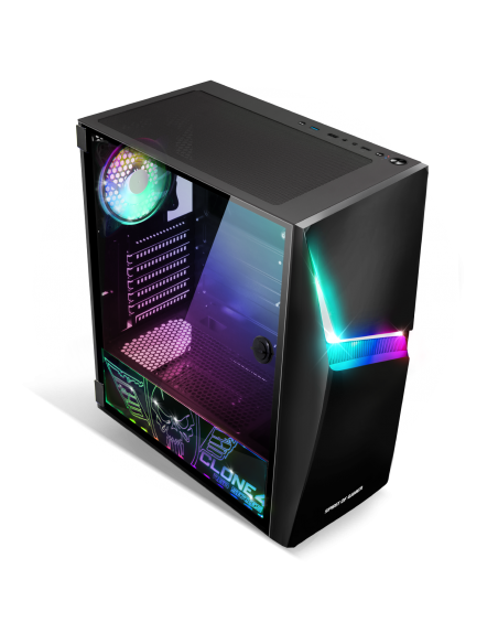 LIGHT SHOW: Spegnere la luce e premere il pulsante di accensione! Clone 4 offre un nuovo design di luce. Infatti, la sua facciata curva à ̈ dotata di una striscia LED ARGB, ma la piÃ1 importante à ̈ sulla sua parete laterale in vetro temperato che rivela l'iconico distintivo Spirit Of Gamer.